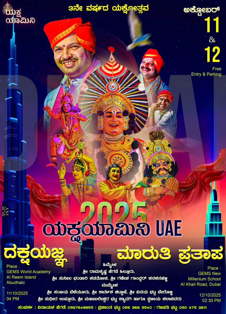 ಅಬುಧಾಬಿ ಅಲ್ ರೀಮ್ ಐಲ್ಯಾಂಡ್ ನ GEMS World Academyಯಲ್ಲಿ ಅಕ್ಟೋಬರ್ 11ರ ಶನಿವಾರ ಸಂಜೆ 4 ಗಂಟೆಗೆ ‘ದಕ್ಷಯಜ್ಞ’ ಯಕ್ಷಗಾನ ಪ್ರದರ್ಶನಗೊಳ್ಳಲಿದೆ.