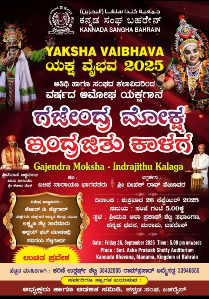 ಬಹರೈನ್: ದ್ವೀಪ ರಾಷ್ಟ್ರ ಬಹರೈನ್ ನಲ್ಲಿ ಕರಾಳಿಯ ಗಂಡು ಕಲೆ ಯಕ್ಷಗಾನ ವಿಜೃಂಭಿಸಲಿದ್ದು, ಸೆಪ್ಟೆಂಬರ್ 26ರ ಶುಕ್ರವಾರದಂದು ಸಂಜೆ ಕನ್ನಡ ಸಂಘದ ಸಾಂಸ್ಕ್ರತಿಕ ಸಭಾಂಗಣದಲ್ಲಿ ವಾರ್ಷಿಕ ಯಕ್ಷಗಾನ ಕಾರ್ಯಕ್ರಮವಾದ “ಯಕ್ಷ ವೈಭವ”ವನ್ನು ಆಯೋಜಿಸಿದ್ದು, ಈ ಕಾರ್ಯಕ್ರಮದಲ್ಲಿ ನಾಡಿನ ಹೆಸರಾಂತ ಯಕ್ಷಕಲಾವಿದರುಗಳು ಹಾಗು ಸಂಘದ ಯಕ್ಷಕಲಾವಿದರುಗಳ ಸಮಾಗಮದೊಂದಿಗೆ “ಗಜೇಂದ್ರ ಮೋಕ್ಷ – ಇಂದ್ರಜಿತು ಕಾಳಗ” ಯಕ್ಷಗಾನ ಪ್ರಸಂಗ ಪ್ರದರ್ಶನವಾಗಲಿದೆ.