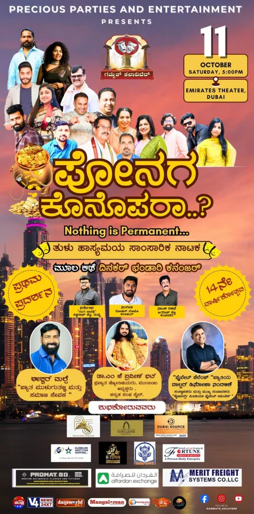 ಅಕ್ಟೋಬರ್ 11ರಂದು ಸಂಜೆ 5 ಗಂಟೆಗೆ ನಗರದ ಎಮಿರೇಟ್ಸ್ ಥೀಯೇಟರ್ ಉಮ್ ಅಲ್ ಸೈಫ್ ನ ಸಭಾಂಗಣದಲ್ಲಿ “ಪೋನಗ ಕೊನೊಪರಾ..?” ಎಂಬ ತುಳು ನಾಟಕ ಪ್ರದರ್ಶನಗೊಳ್ಳಲಿದೆ.