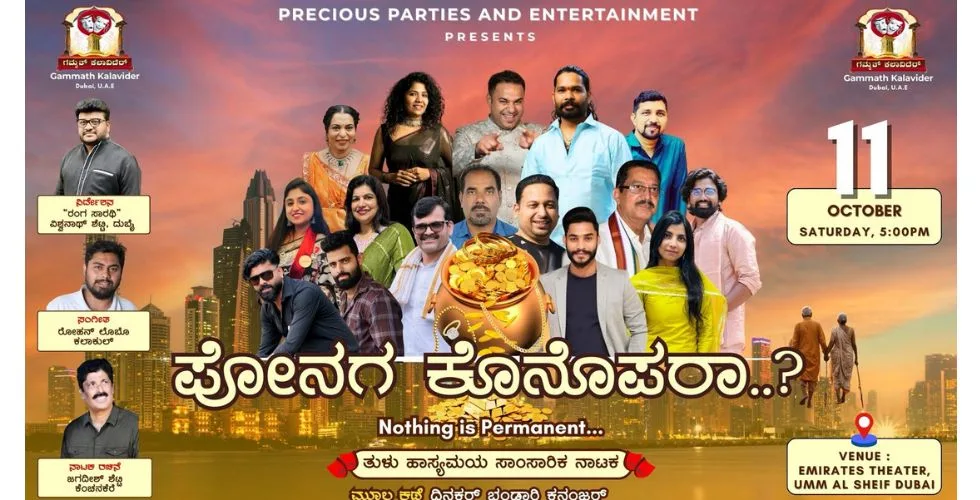 ಅಕ್ಟೋಬರ್ 11ರಂದು ಸಂಜೆ 5 ಗಂಟೆಗೆ ನಗರದ ಎಮಿರೇಟ್ಸ್ ಥೀಯೇಟರ್ ಉಮ್ ಅಲ್ ಸೈಫ್ ನ ಸಭಾಂಗಣದಲ್ಲಿ “ಪೋನಗ ಕೊನೊಪರಾ..?” ಎಂಬ ತುಳು ನಾಟಕ ಪ್ರದರ್ಶನಗೊಳ್ಳಲಿದೆ.