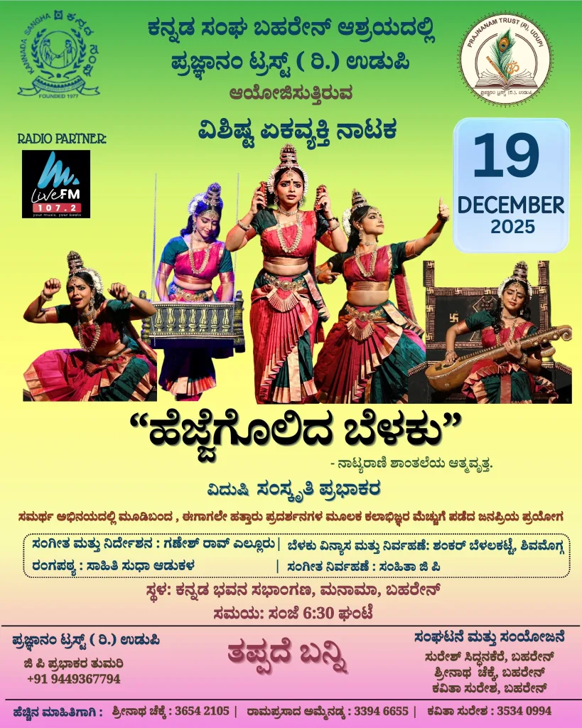 ಬಹರೈನ್: ಬಹರೈನ್ನ ಕನ್ನಡ ಸಂಘದ ಆಶ್ರಯದಲ್ಲಿ ಉಡುಪಿ ಪ್ರಜ್ಞಾನಂ ಟ್ರಸ್ಟ್ (ರಿ)ನಿರ್ಮಿಸಿದ ವಿಶಿಷ್ಟ ಏಕವ್ಯಕ್ತಿ ನಾಟಕ “ಹೆಜ್ಜೆ ಗೊಲಿದ ಬೆಳಕು” ಬಹರೈನ್ನ ಮನಾಮಾದ ಕನ್ನಡ ಭವನದಲ್ಲಿ ಡಿಸೆಂಬರ್ 19ರ ಶುಕ್ರವಾರದಂದು ಅದ್ದೂರಿಯಾಗಿ ಪ್ರದರ್ಶನಗೊಳ್ಳಲಿದೆ.