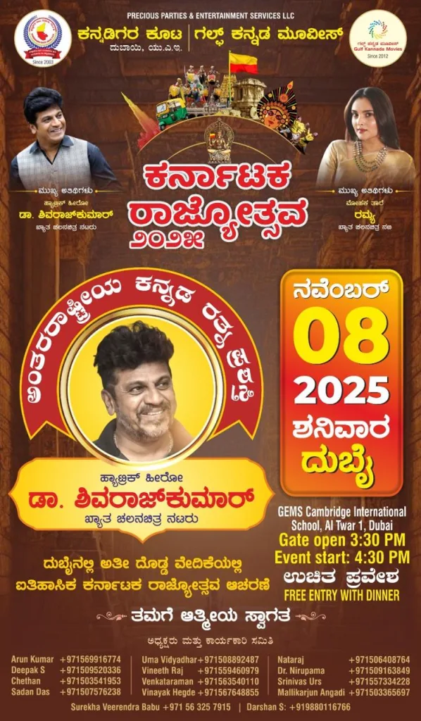ದುಬೈ: ಕನ್ನಡಿಗರ ಕನ್ನಡ ಕೂಟ ದುಬೈ ಯುಎಇ ಮತ್ತು ಗಲ್ಫ್ ಕನ್ನಡ ಮೂವೀಸ್ ಜಂಟಿಯಾಗಿ ಆಯೋಜಿಸಿರುವ “ಕರ್ನಾಟಕ ರಾಜ್ಯೋತ್ಸವ -2025” ಕಾರ್ಯಕ್ರಮವು ನವೆಂಬರ್ 8ರಂದು ಸಂಜೆ 4.30ರಿಂದ ದುಬೈಯ ಕಿಸೀಸ್ ನ ಜೆಮ್ಸ್ ಕೇಂಬ್ರಿಜ್ ಅಂತಾರಾಷ್ಟ್ರೀಯ ಶಾಲೆಯ ಸಭಾಂಗಣದಲ್ಲಿ ನಡೆಯಲಿದೆ.