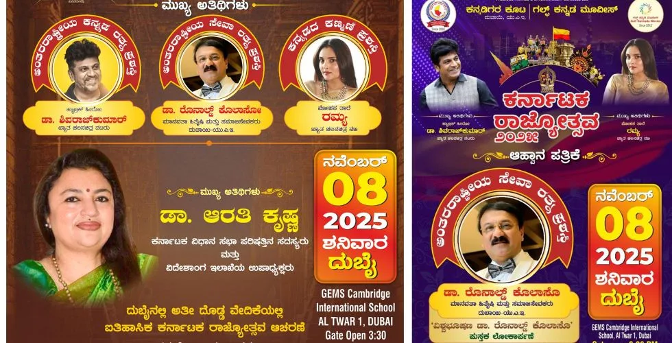 ನ.8ರಂದು ದುಬೈಯಲ್ಲಿ ‘ಕನ್ನಡಿಗರ ಕೂಟ-ಗಲ್ಫ್ ಕನ್ನಡ ಮೂವೀಸ್’ನಿಂದ ‘ಕರ್ನಾಟಕ ರಾಜ್ಯೋತ್ಸವ’; ಡಾ.ಆರತಿ ಕೃಷ್ಣ ಸ್ವಾಗತಕ್ಕೆ ಸಿದ್ಧತೆ: ಡಾ.ರೊನಾಲ್ಡ್ ಕೊಲಾಸೊ, ಶಿವರಾಜ್ ಕುಮಾರ್, ರಮ್ಯಾಗೆ ಪ್ರಶಸ್ತಿ
